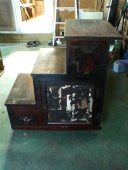 築300年の古民家から やっとの思いで運び出した階段箪笥(上3段)です。下の段は傷みが酷く、床から離すことができず・・お客様には諦めてもらいました。扉の中の棚、抽斗の底板など新しいものに交換し、再塗装して13万円でした。